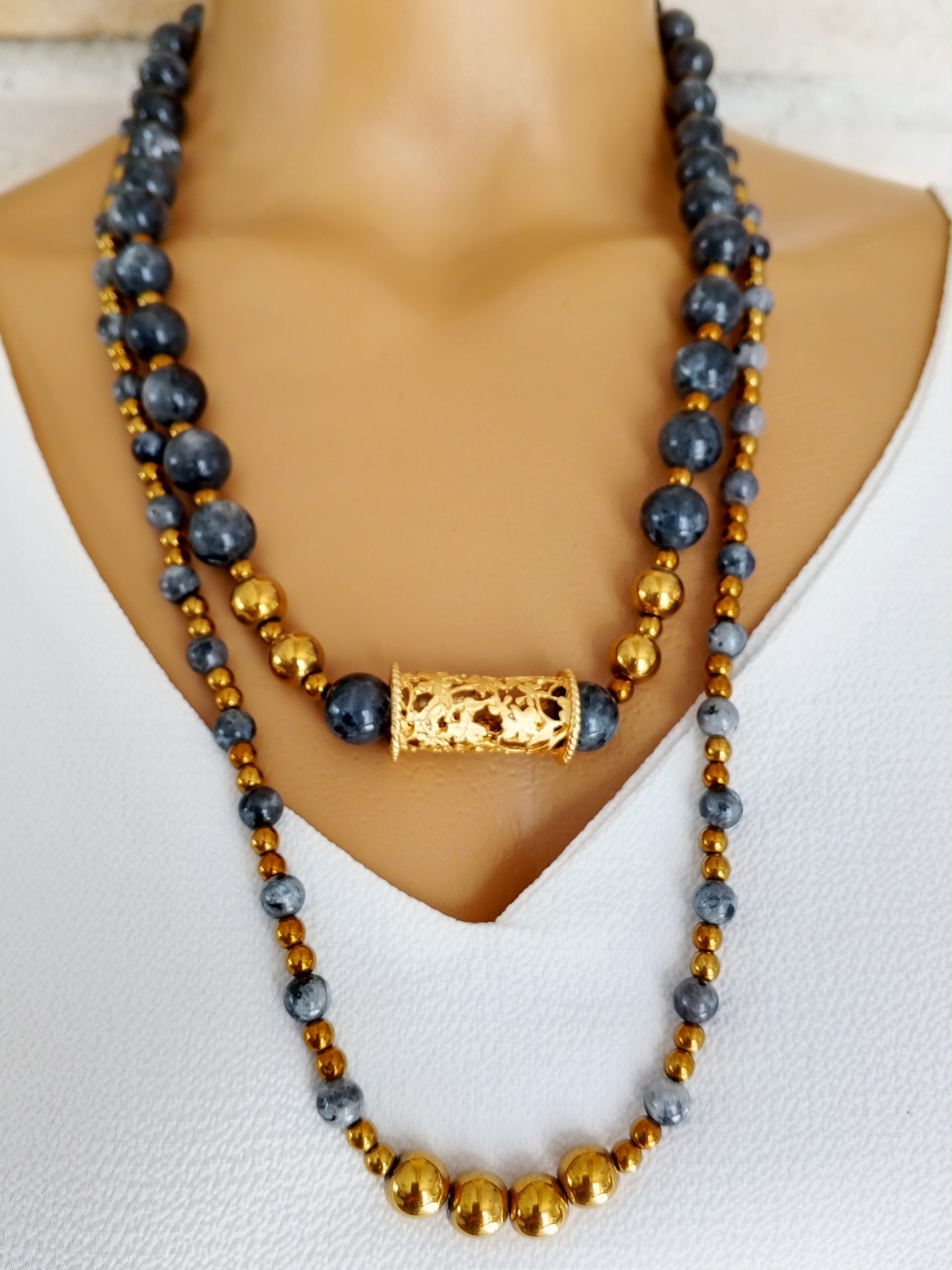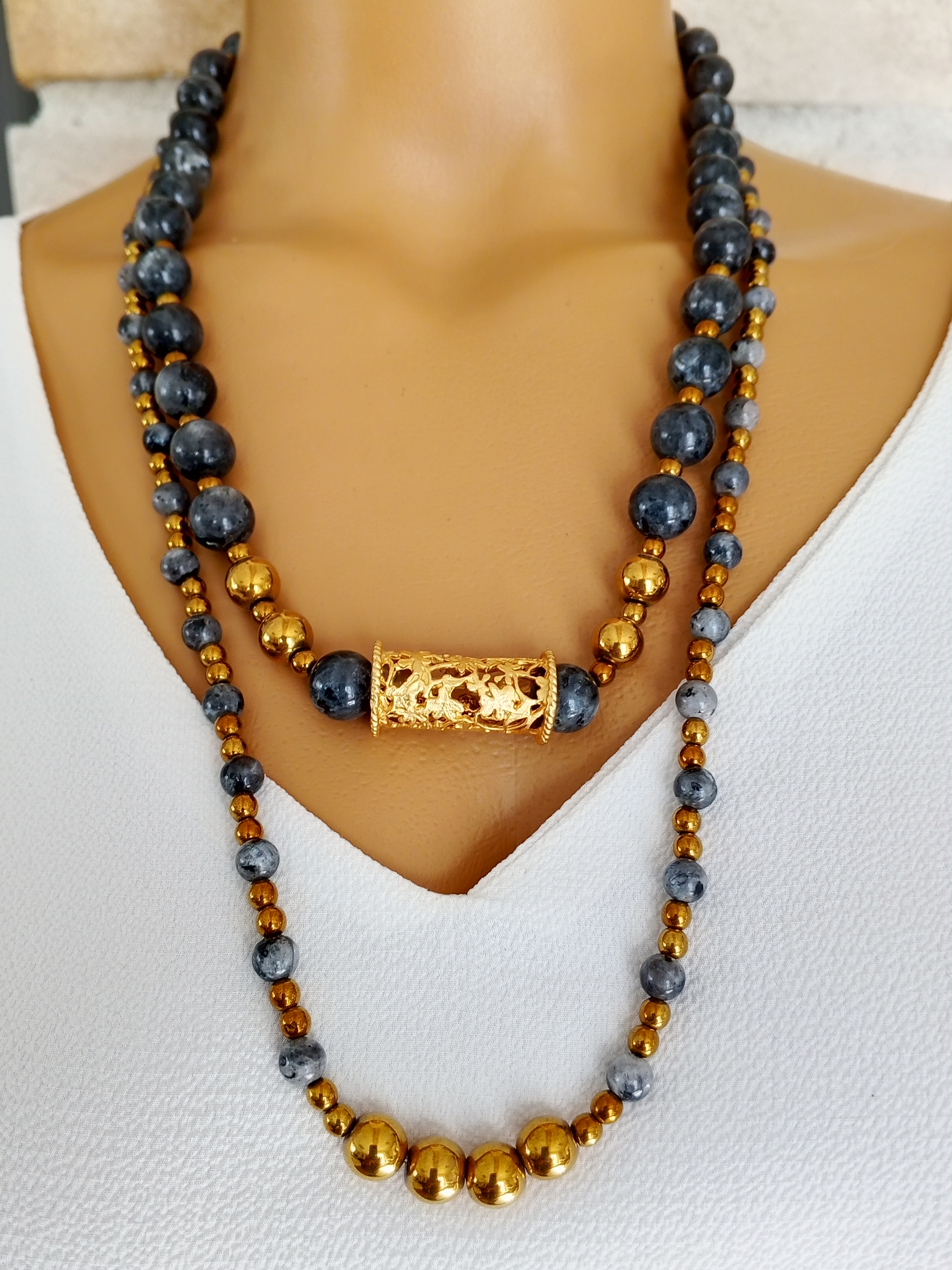 - Tasarımlar: Üçlü kolye, farklı boyutlardaki labrodorit taşlarını içermektedir.