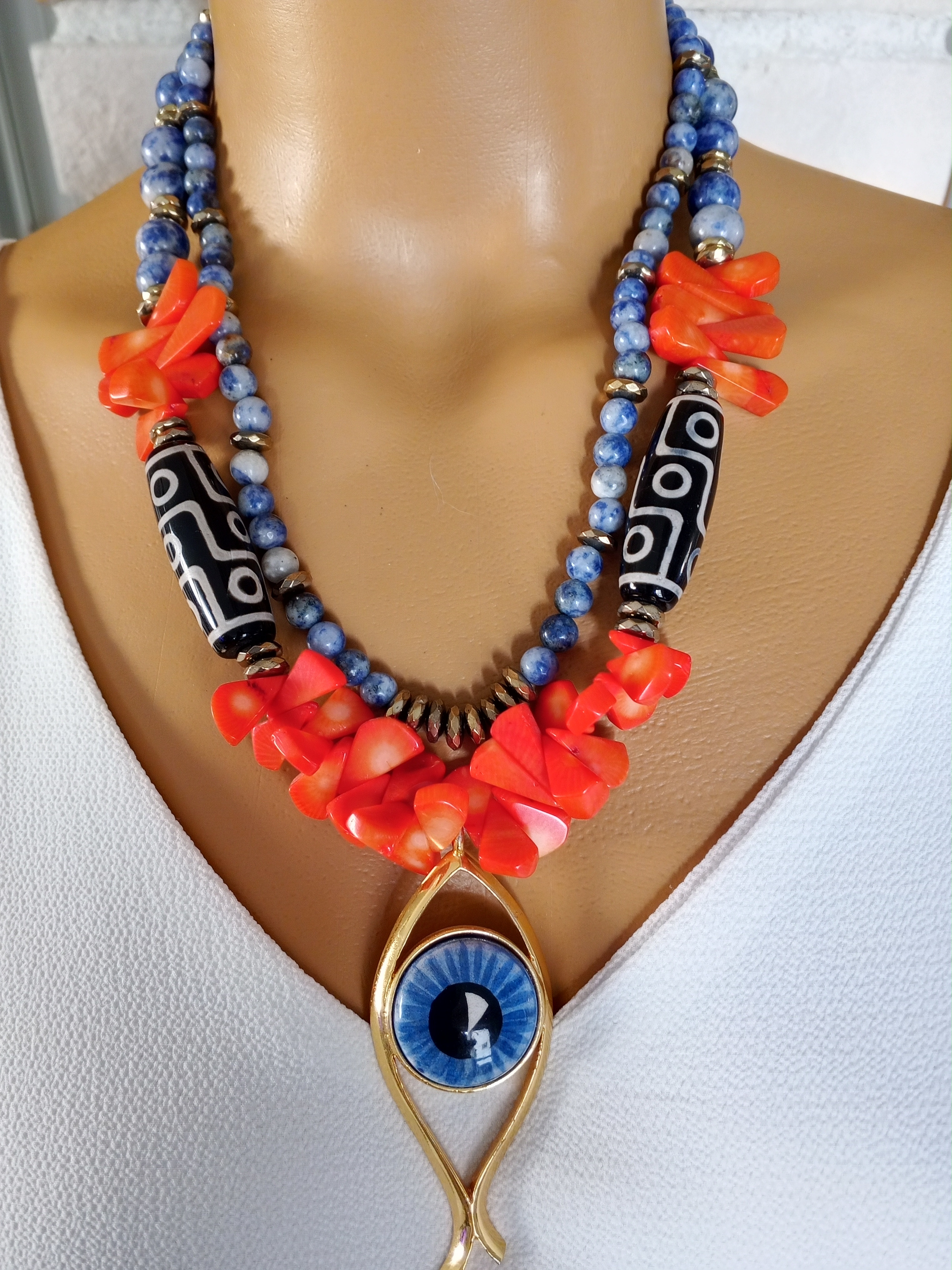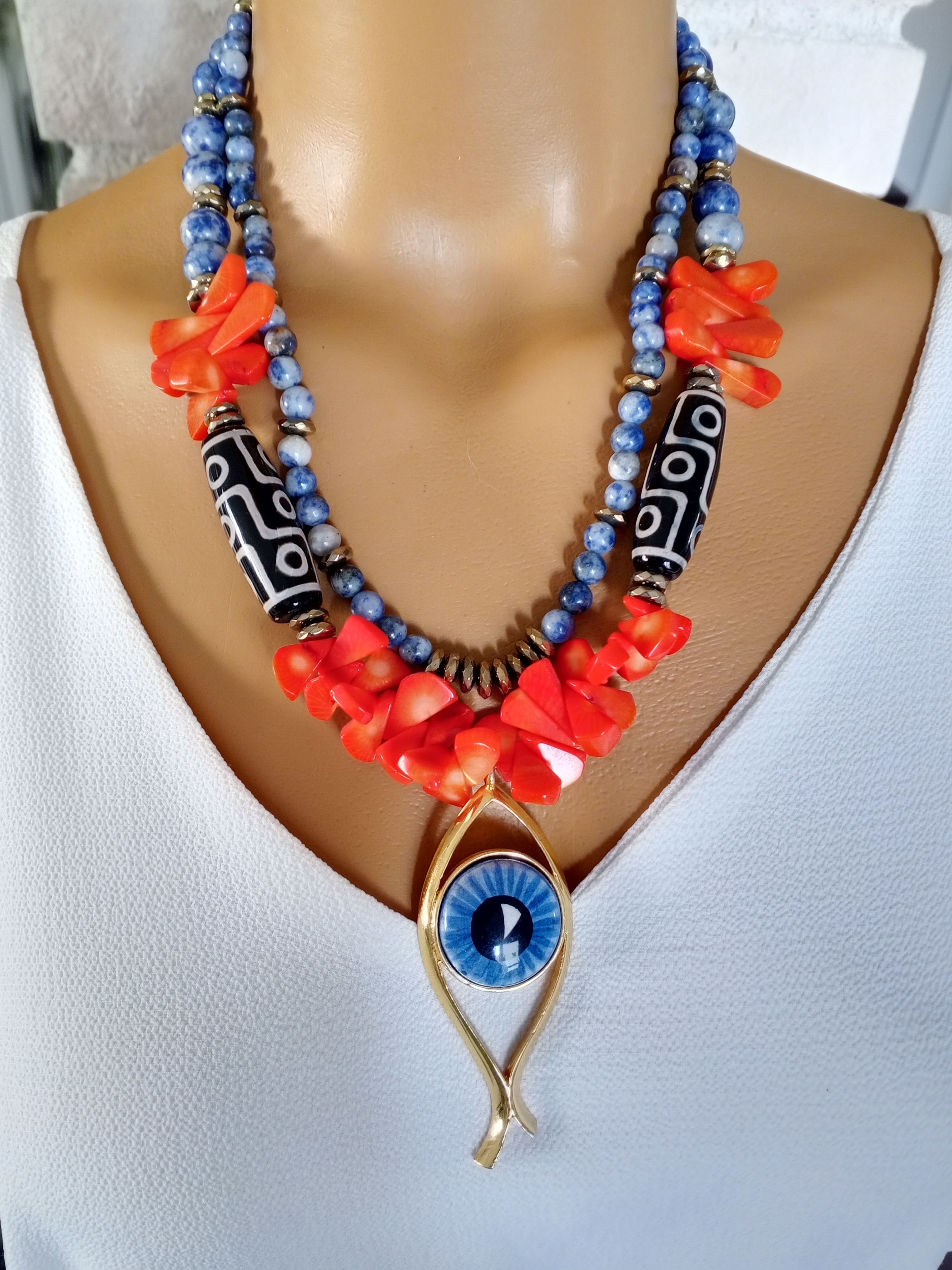 MERCAN - TİBET AKİĞİ - SODALİT VE SERAMİK GÖZ DOĞALTAŞ KOLYE