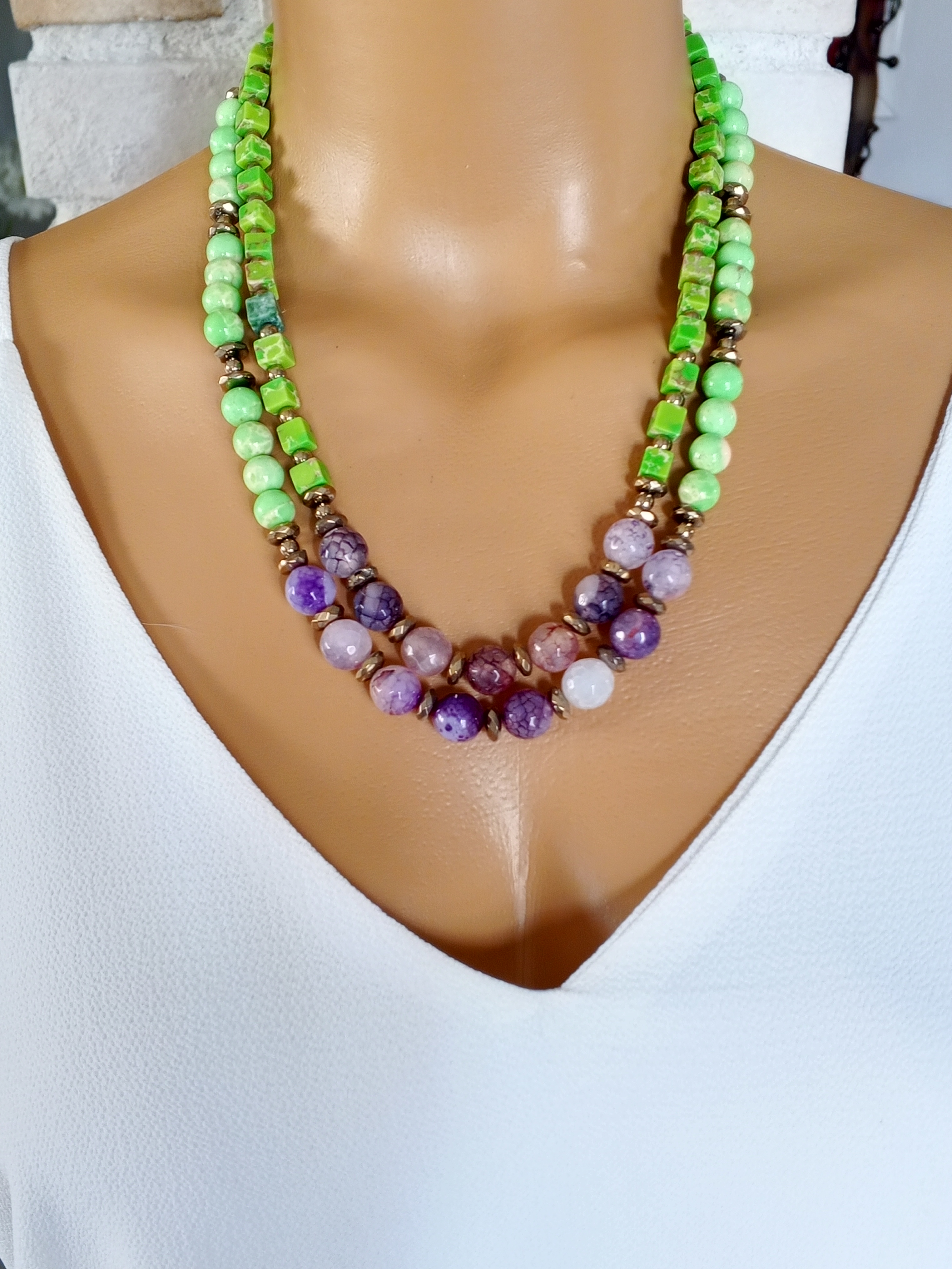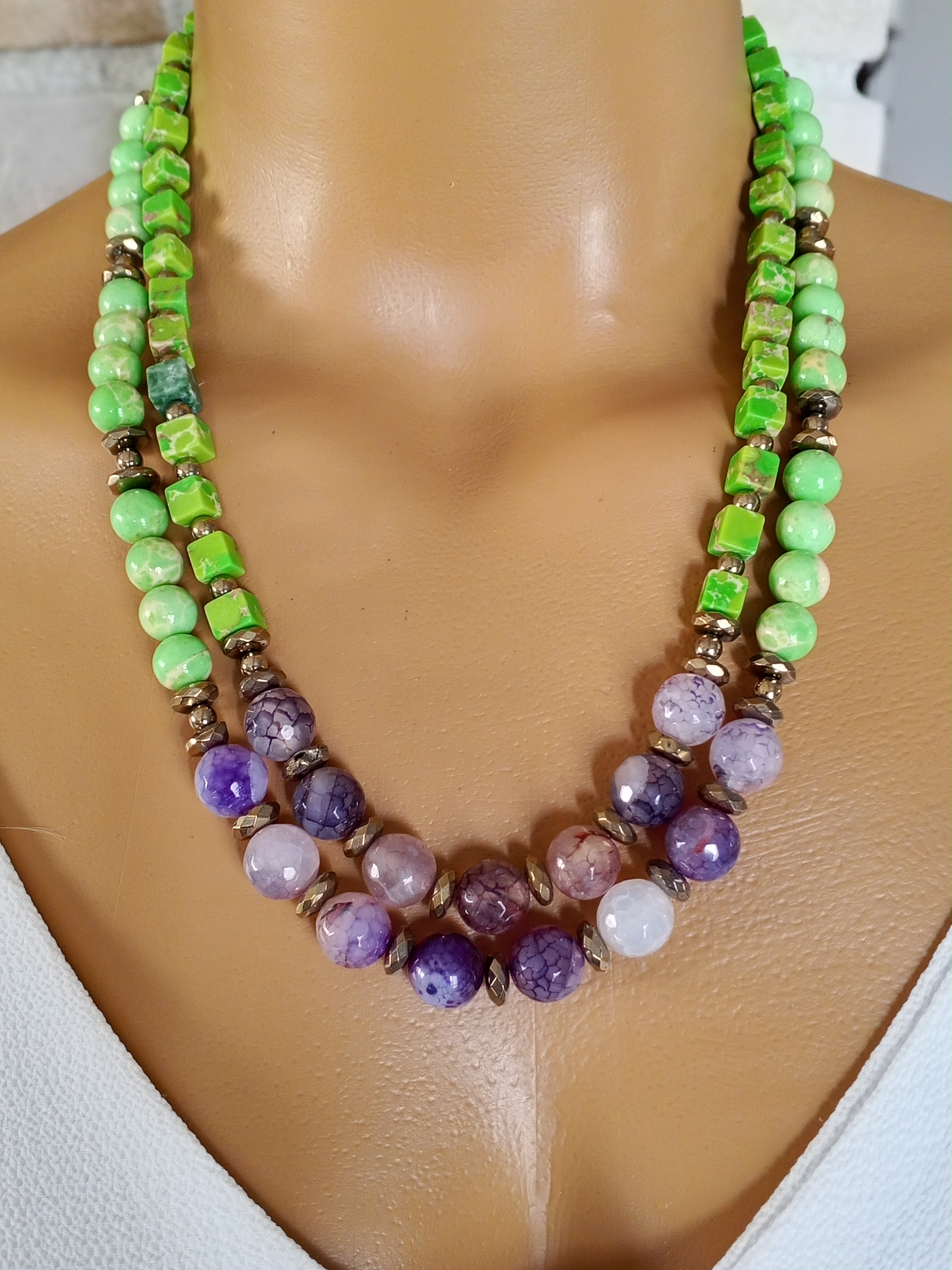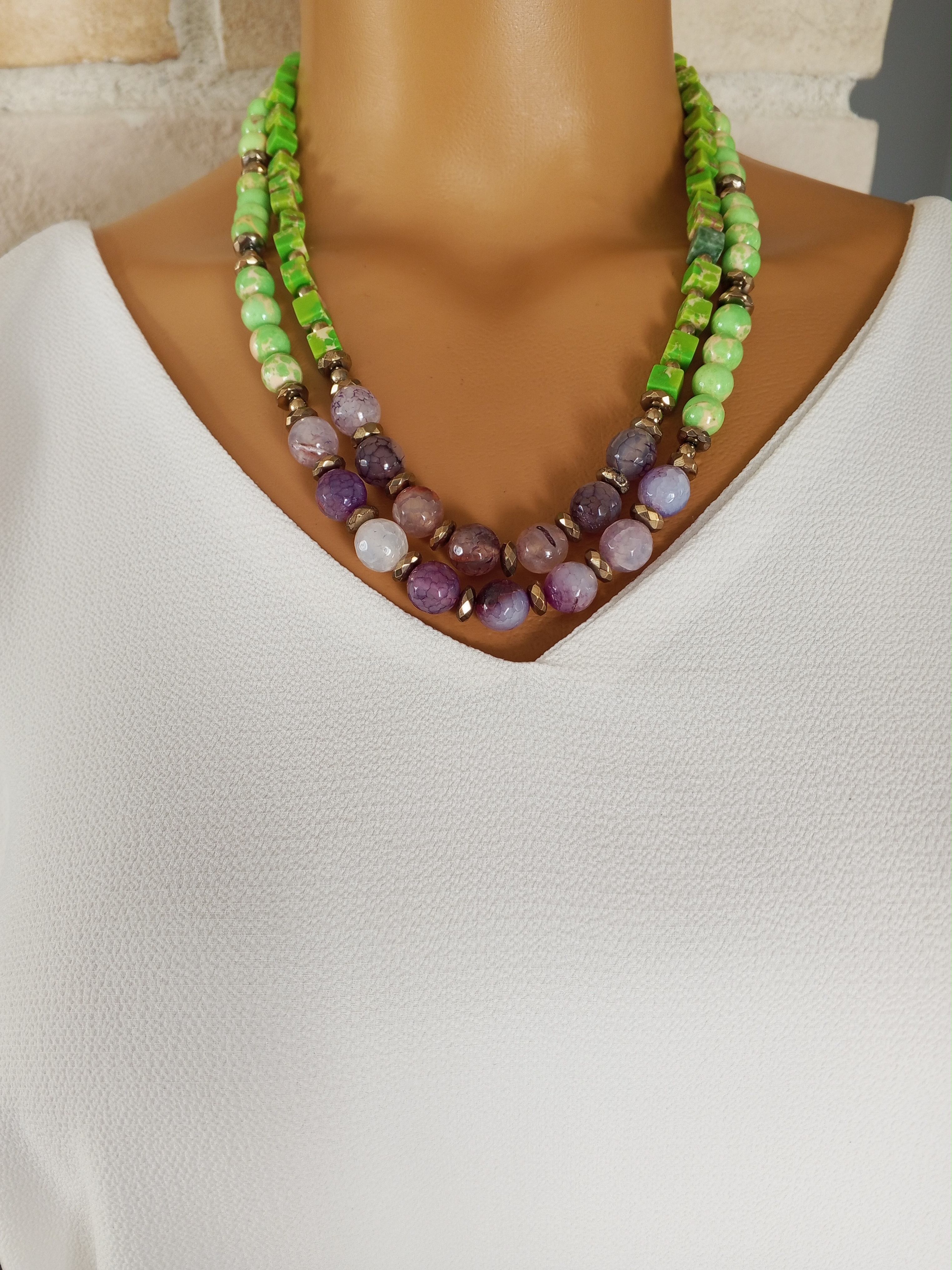 MOR AKİK - YEŞİL VARASİT - HEMATİT DOĞALTAŞ KOLYE