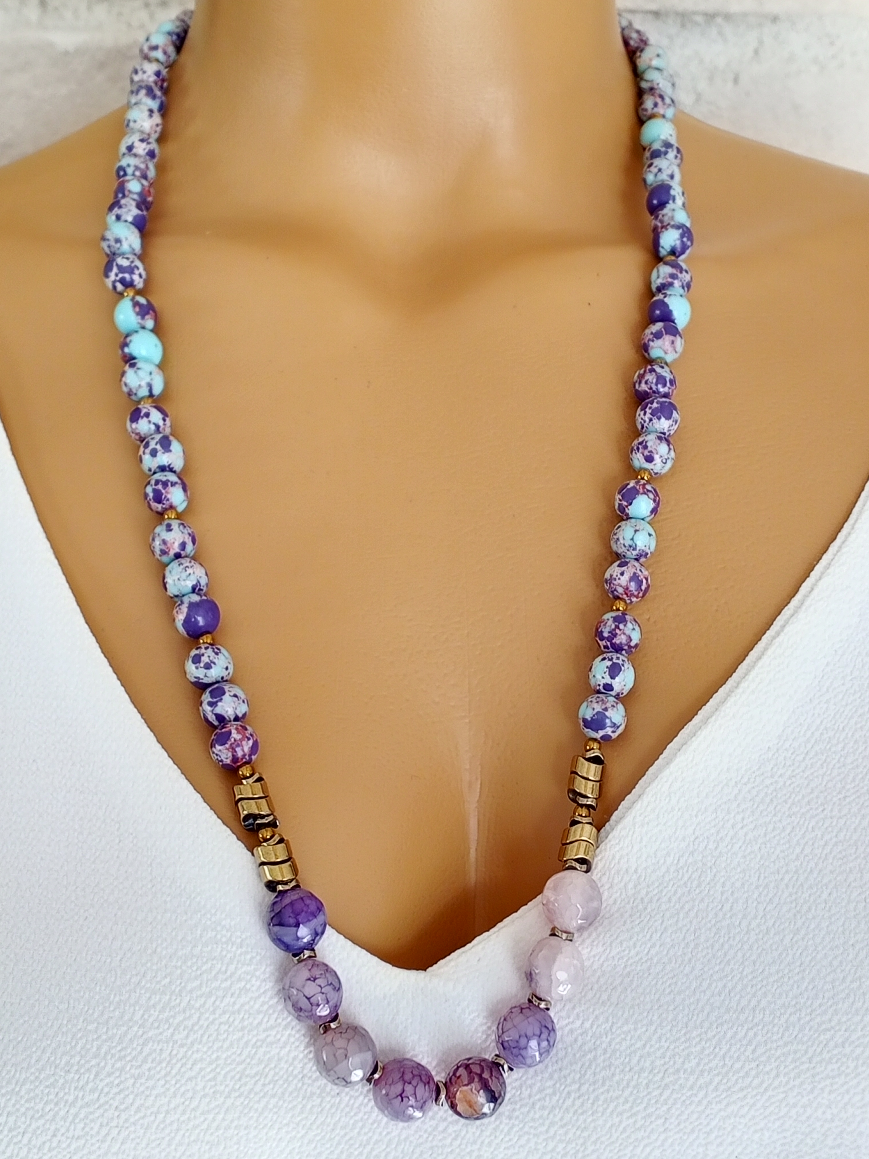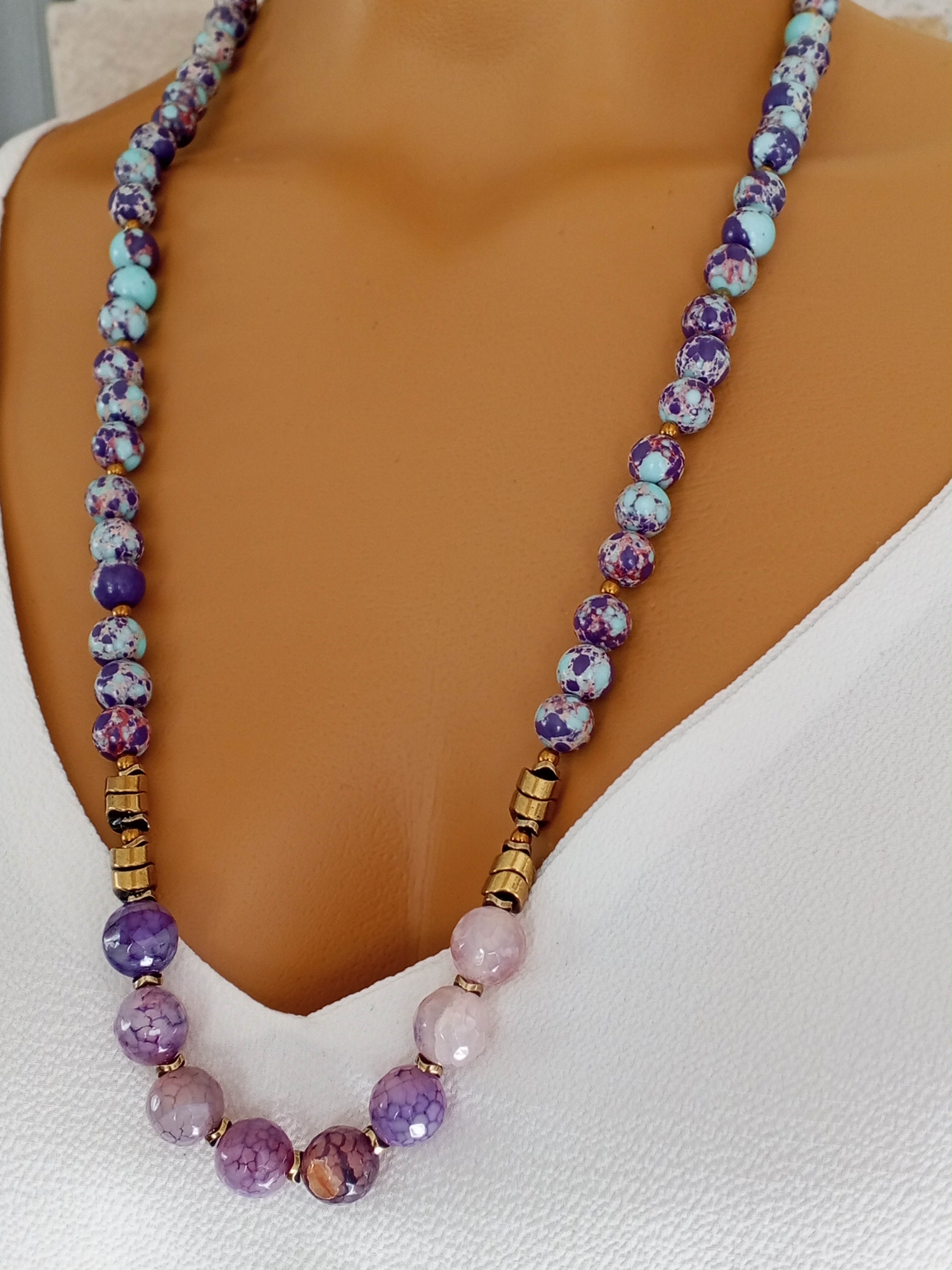 Şıklığı ve zarafeti bir arada sunan Mor Varasite, Akik ve Hematit taşlarından üretilen bu uzun kolye, stilinizi tamamlayacak ve her ortamda dikkat çekmenizi sağlayacak muhteşem bir aksesuardır.