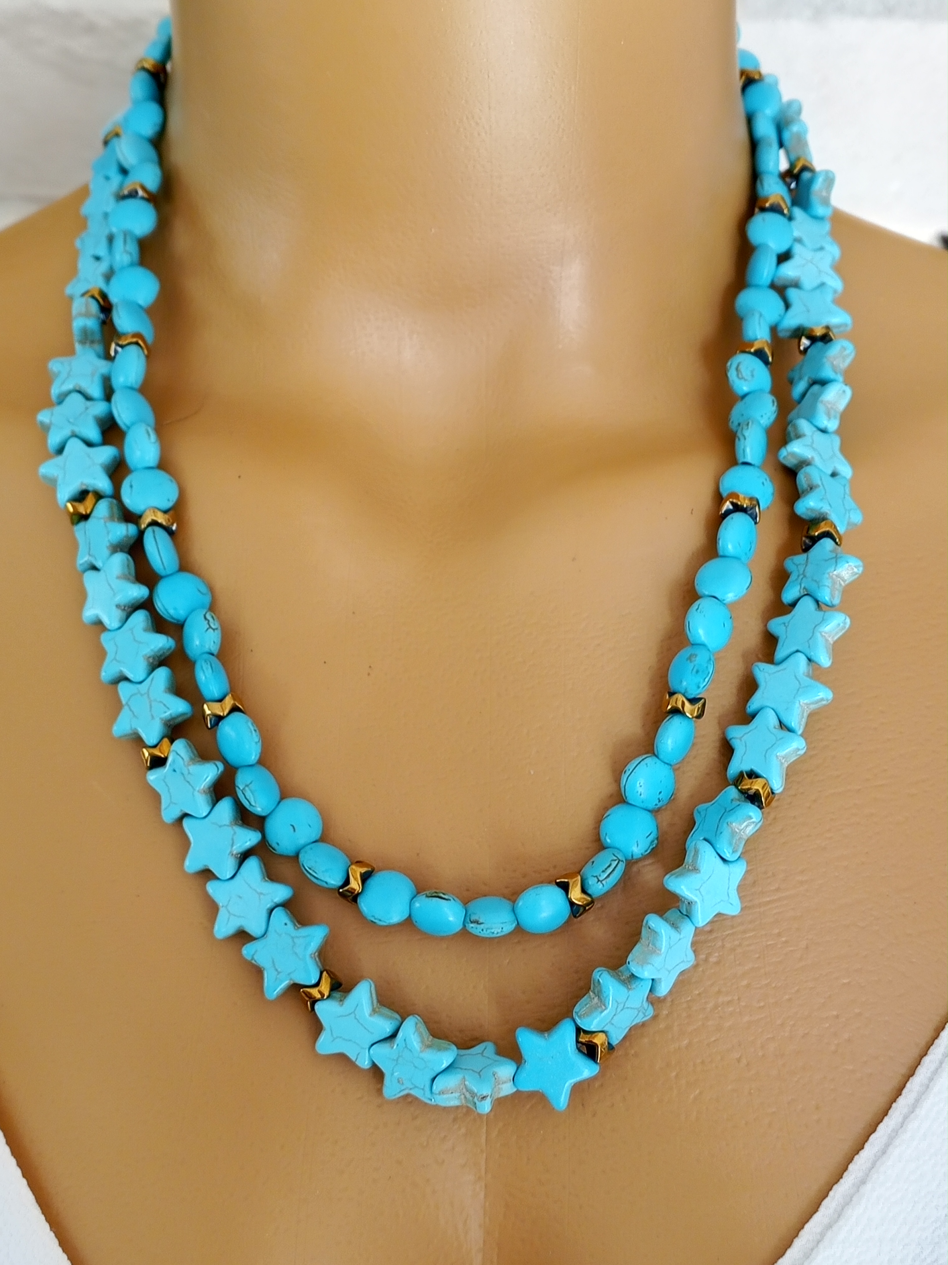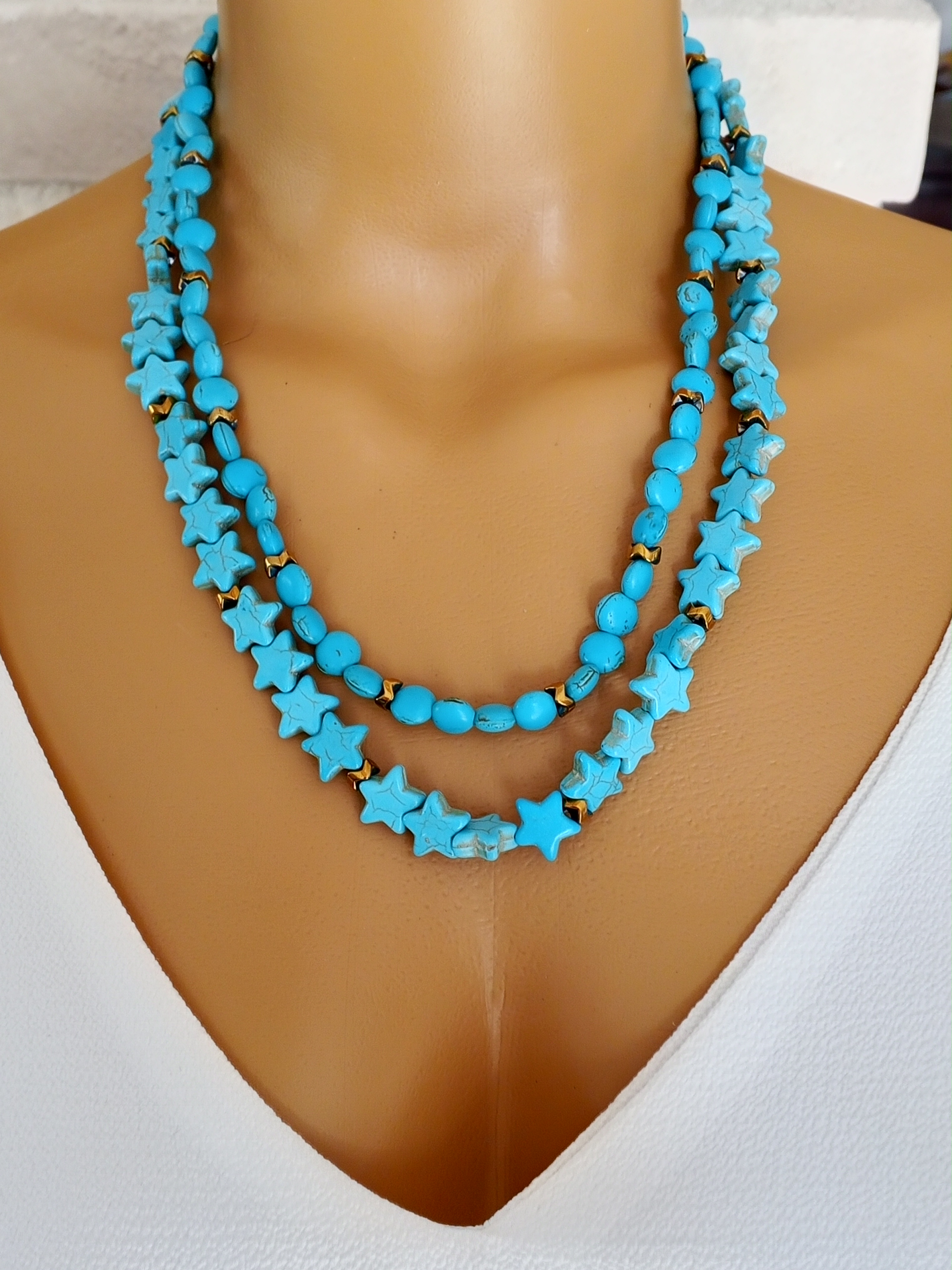 TURKUAZ İKİLİ KOLYE, iki farklı boyutta taşları bir araya getirerek göz alıcı bir görünüm sunmaktadır. Birinci parça, daha büyük ve etkileyici bir turkuaz taş ile tasarlanırken, ikinci parça daha ince ve narin bir görünüm sunmaktadır. Bu iki taşın birleşimi, katmanlı bir görünüm oluşturur ve boyun hattınızı zarif bir şekilde vurgular.