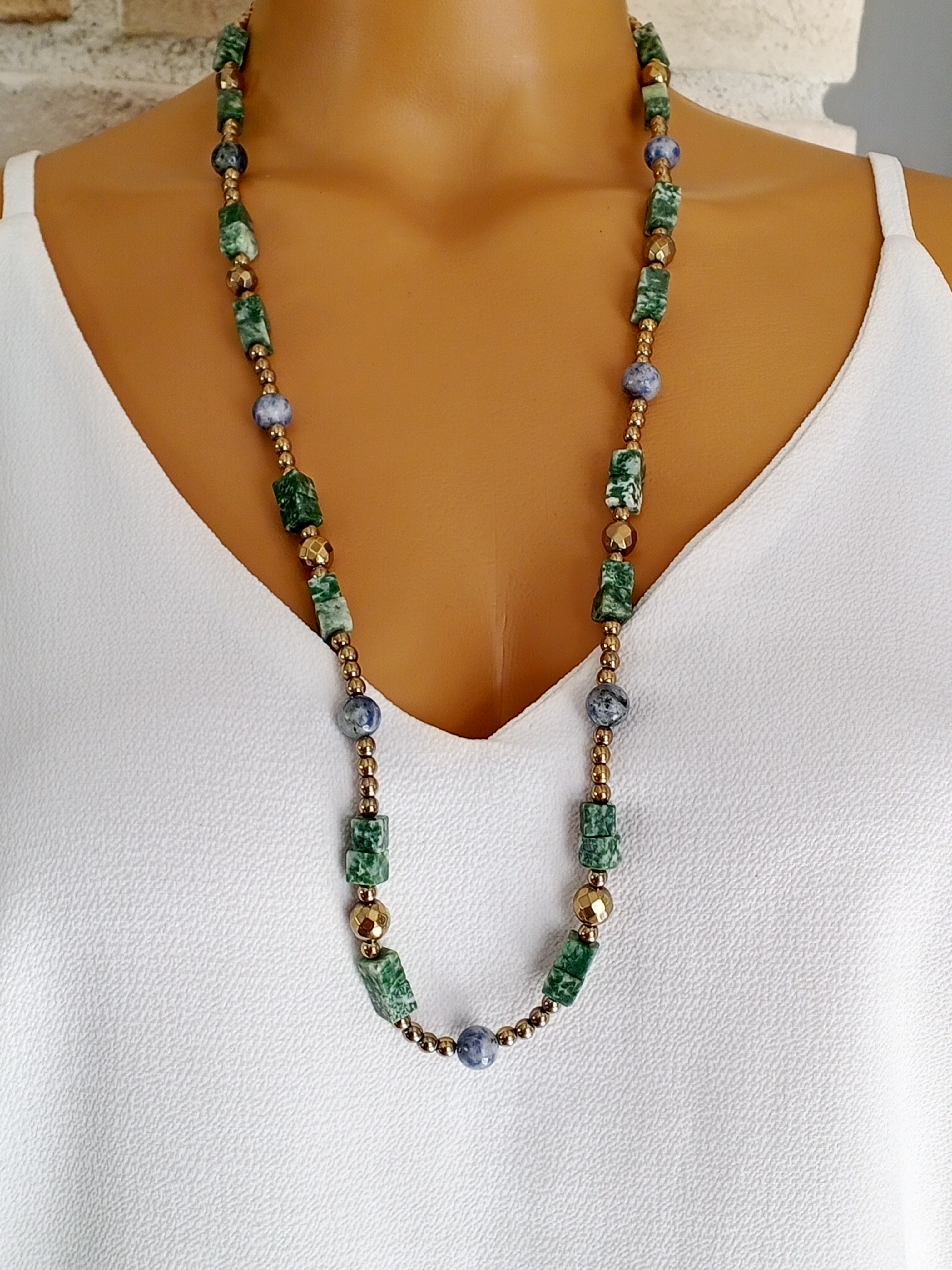 Şıklığı ve zarafeti bir araya getiren VARASİT, SODALİT ve HEMATİT uzun kolye, özel tasarımıyla dikkat çekerken, hem günlük kullanım hem de özel davetler için mükemmel bir aksesuar seçeneğidir. Her biri kendine has özellikleriyle öne çıkan taşlar, enerji ve stil dolu bir kolye oluşturmak üzere bir araya gelmiştir.